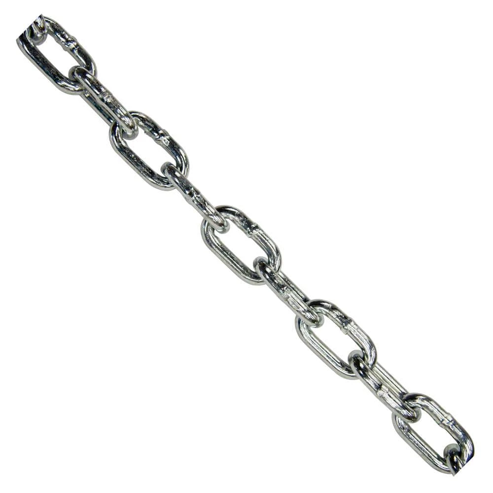 KingChain Grade 30 chain is an excellent general purpose, low carbon utility chain. The chain is manufactured to NACM standards. Each link is proof tested 2 times and the break load is 4 times the Safe Work Load (design factor 4:1). It is recommended for applications that do not require high strength-to-weight ratios. It is often used on farms, in industry and at home for general purpose applications, such as pulling stumps, lashing cargo, truck tailgates and guard rails. Chain is zinc plated for a bright, attractive finish with moderate corrosion resistance. Do not use for overhead lifting. Never exceed the Safe Working Load (SWL).