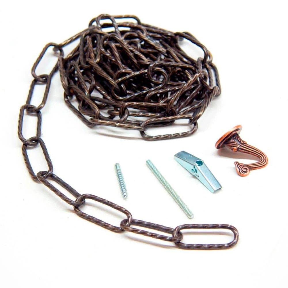 KingChain decorative chains are light-duty, non-welded chains used for hanging lights, flower pots, drape ties and other needs within the home. They have beautiful finishes that accentuate any space, both indoor and outdoor. Spiral Oval has a long link with wire that’s twisted before the chain link is closed. It’s quite unique. The chain has a darkened “Antiqued” finish. It is made from solid brass, so its finish should not tarnish. This chain has a Safe Work Load (SWL) of 45 lbs. (20 kg). This kit also includes one toggle bolt and 1 ceiling hook, so everything is included. The toggle bolt and hook can be used with hollow and solid walls/ceilings.