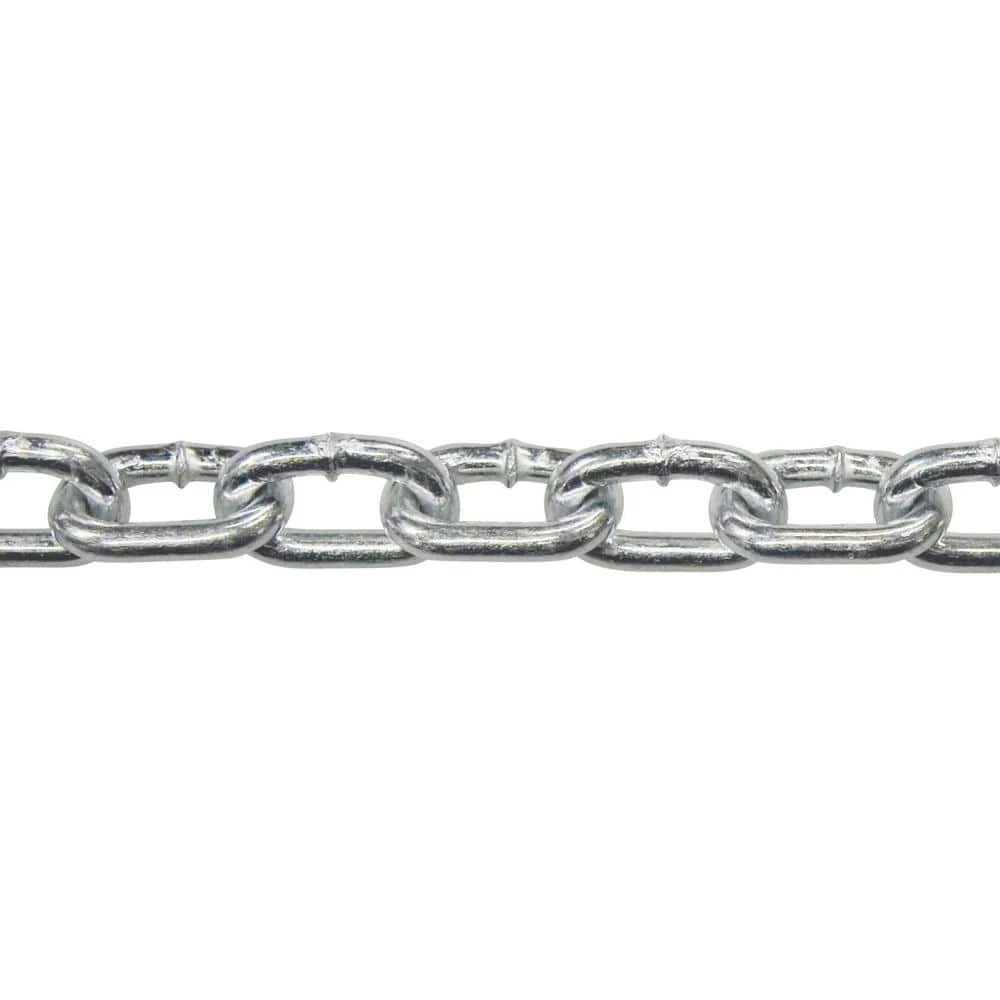 Straight Link Coil Chain is an excellent general purpose, low carbon utility chain that is easily identified by its link design. The chain is manufactured to NACM standards. Each link is proof tested 2 times and the break load is 4 times the Safe Workload (design factor 4:1). Straight Link Coil Chain is recommended for applications that do not require high strength-to-weight ratios. It is typically used for tailgates, barrier guards, swing sets, hanging light fixtures and animal chains. Chain is zinc plated for a bright, attractive finish with moderate corrosion resistance. Do not use for overhead lifting. Never exceed the Safe Working Load (SWL).