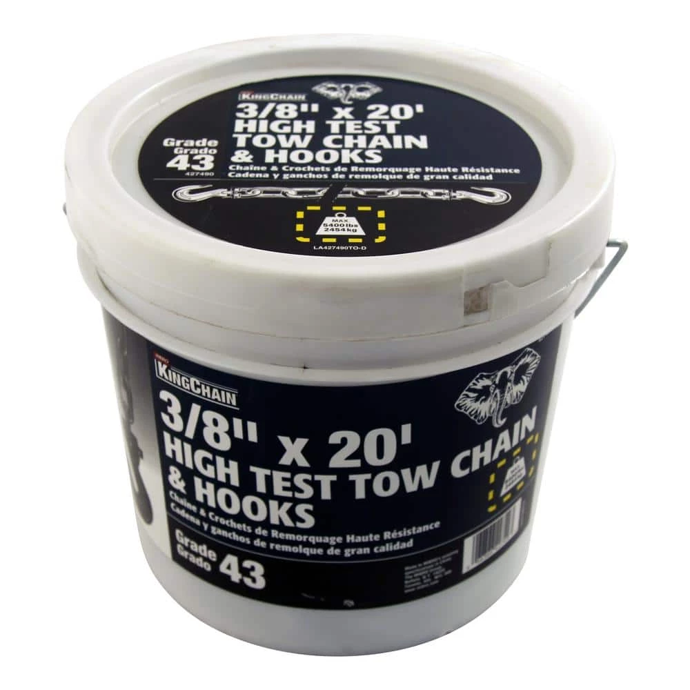 KingChain Grade 43 tow chains are ideal for pulling, binding, securing, and towing all types of loads. The tow chain has forged Grade 43 clevis grab hooks at both ends. Used to tie down or bind loads for transportation and can be used with chain blocks or winch pullers. May be used in accordance with the latest D.O.T. regulations. Both the chain and hooks are stamped with G43, for identification and to ensure compliance with DOT standards. Chain and hooks are zinc plated for a bright, visible finish with moderate corrosion resistance. The chain features our standard G43 short link chain, which fatigue less, last longer and provide more hooking points for your binders and hooks (compared to long-link chain). This chain complies with the D.O.T. standards for all major transportation fleets and Canada. Never exceed the 5,400 lbs. (2,455 kg) Safe Work Load. Not for overhead lifting.
