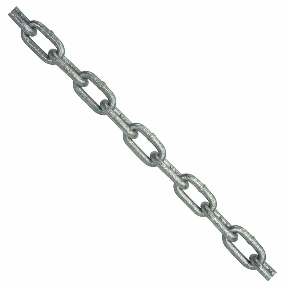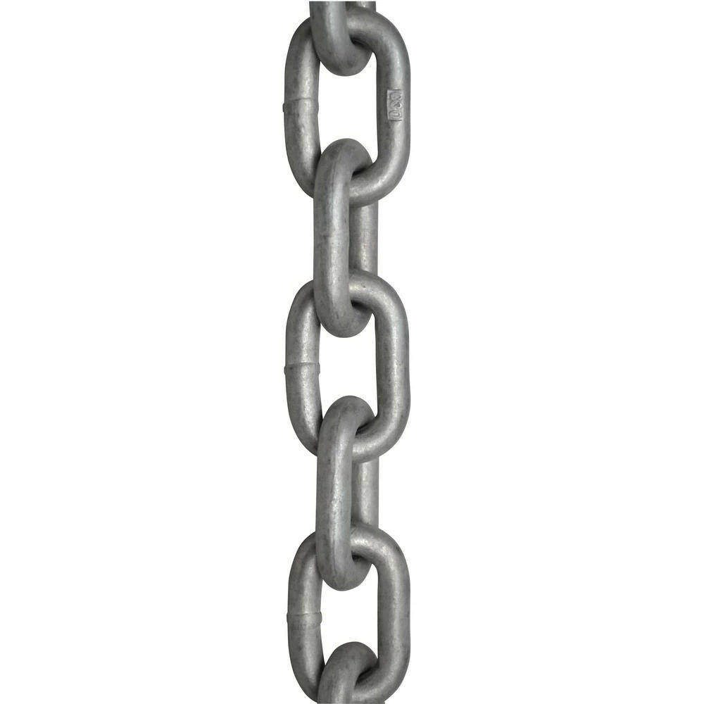 KingChain Grade 30 chain is an excellent general purpose, low carbon utility chain. The chain is manufactured to NACM standards. Each link is proof tested 2 times and the break load is 4 times the Safe Work Load (design factor 4:1). It is recommended for applications that do not require high strength-to-weight ratios. It is often used on farms, in industry and at home for general purpose applications, such as pulling stumps, lashing cargo, truck tailgates and guard rails. Chain is galvanized which provides with excellent corrosion resistance. Do not use for overhead lifting. Never exceed the Safe Working Load (SWL).