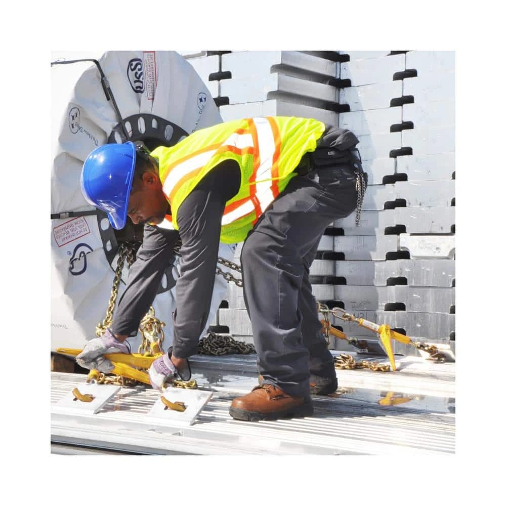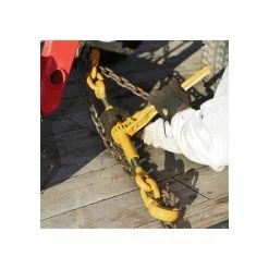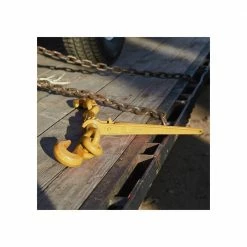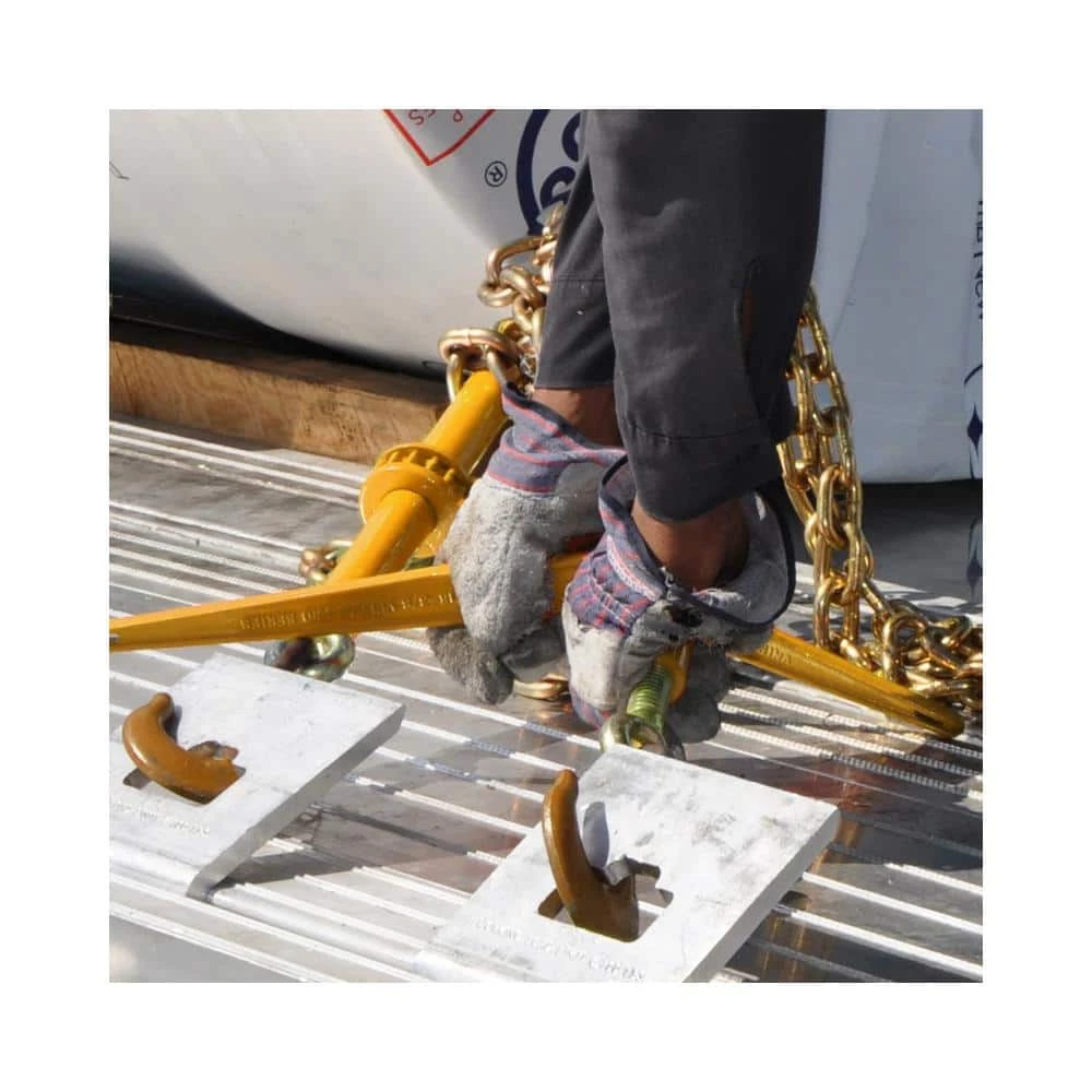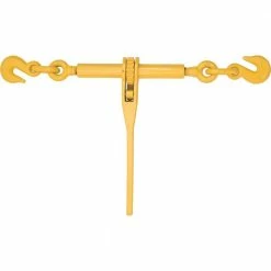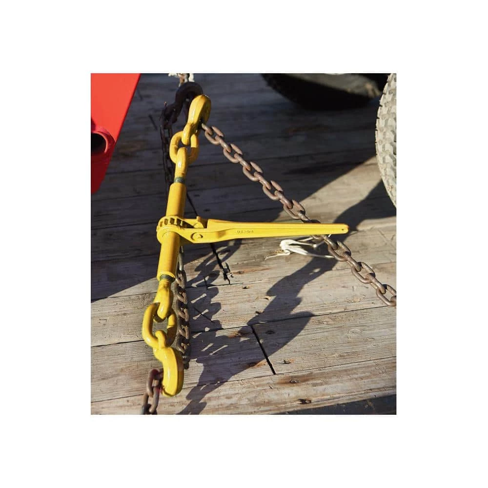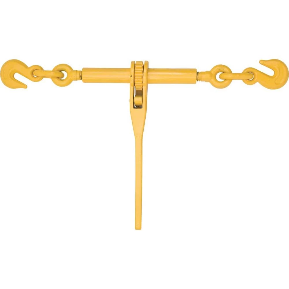 KingChain ratchet-type load binders are made from drop-forged steel and are designed for securing loads in chain binding applications on flatbed trucks and rail cars, as well as for cargo holding in the marine industry. Our chain binders are made for heavy-duty transport securement, and have the size, break strength, and work load limit clearly marked on the handle for quick identification. Meets U.S. D.O.T. 393.100-393.102 requirements for use with chain. Includes grab hooks at both ends, which swivel 360° for easy attachment. Painted safety yellow for high visibility. Ratchet-type binder tighten more slowly than lever-types, but they are easier to operate and they do not require a handle to lock in place to ensure the binder stays tightened. This load binder is made for either 5/16 in. or 3/8 in. chain, but must be used with 5/16 in. Grade 70 Transport Chain in order for your load binding assembly to meet the Grade 70 transport standards for cargo securement set by the US DOT. Do not exceed a work load limit of 5400 lbs.