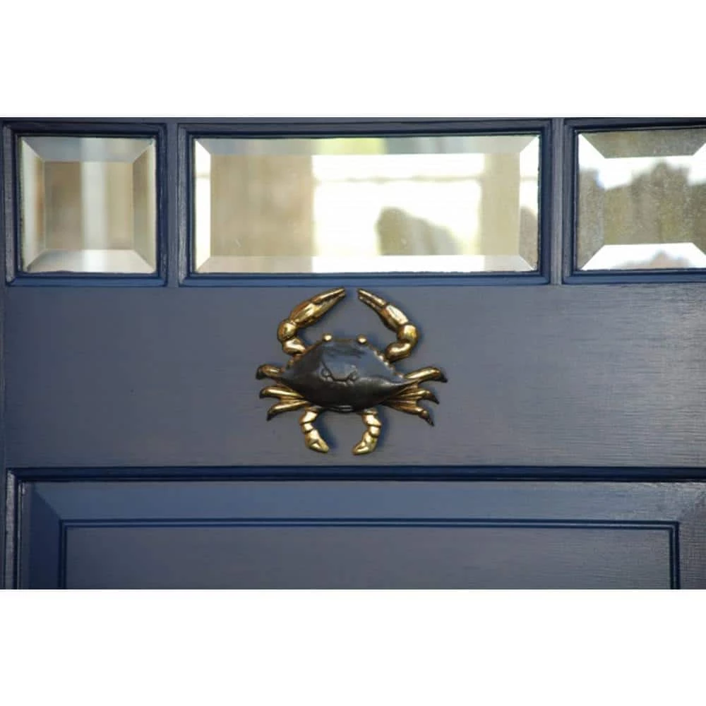 The Crab is sand-cast in solid Brass and designed by Michael Healy, a Rhode Island artisan known for his truly Unique Door Knockers. The door knocker is polished by hand and then given a protective coating to maintain its beautiful finish. Michaels signature adorns each piece. This item is surface mounted so no hardware will be visible on the door interior.