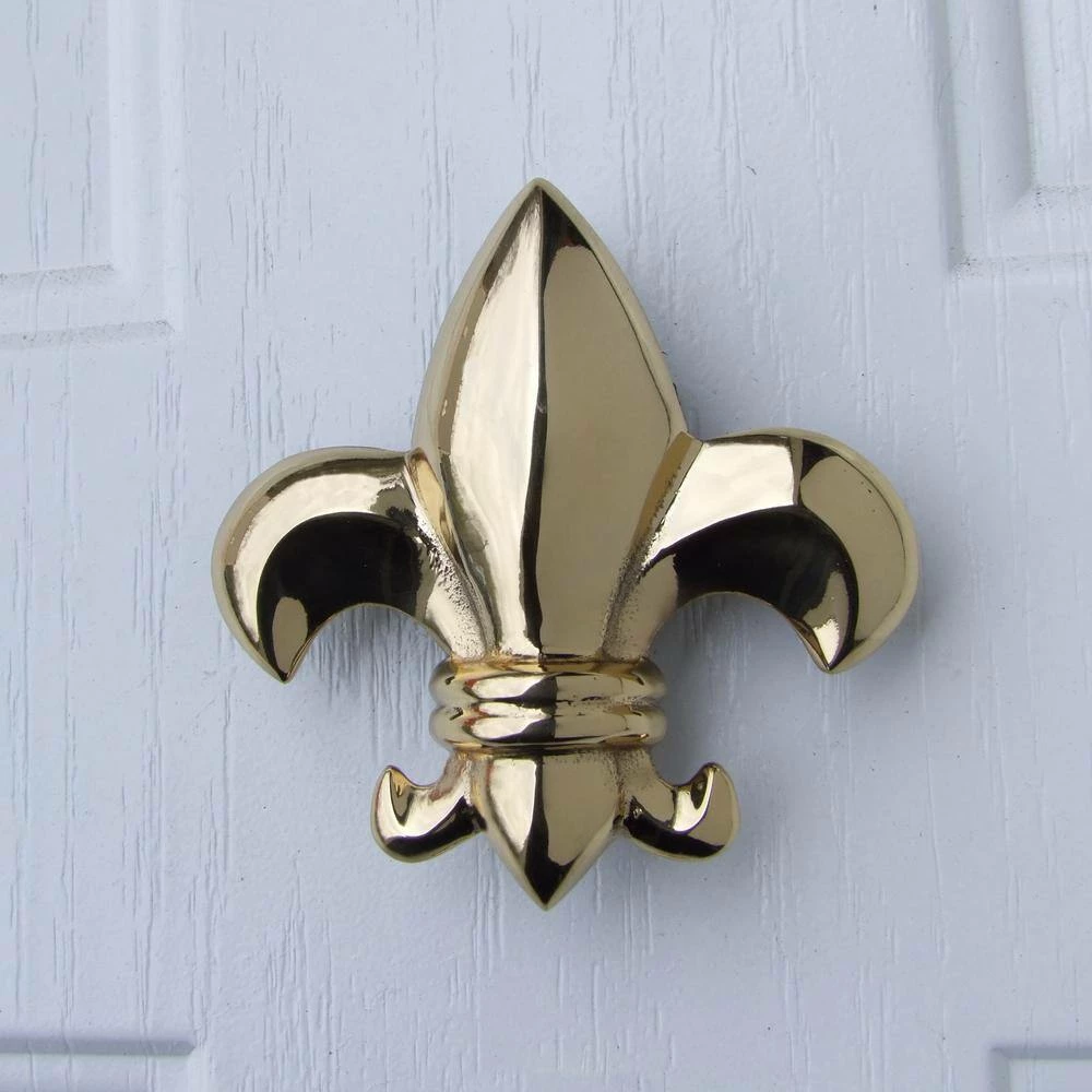 The Fleur De Lys is sand-cast in solid Brass and designed by Michael Healy, a Rhode Island artisan known for his truly Unique Door Knockers. The door knocker is polished by hand and then given a protective coating to maintain its beautiful finish. Michaels signature adorns each piece. This item is surface mounted so no hardware will be visible on the door interior.