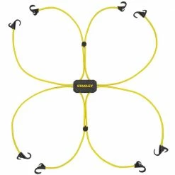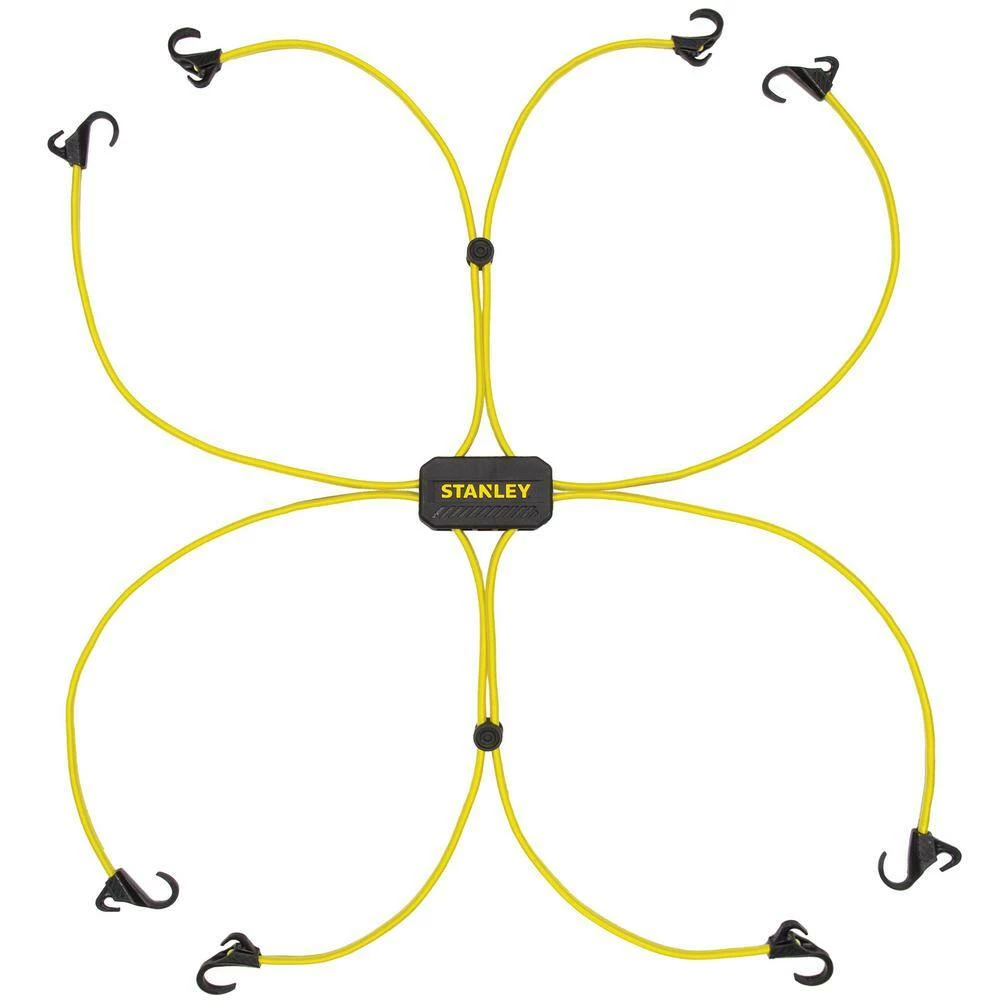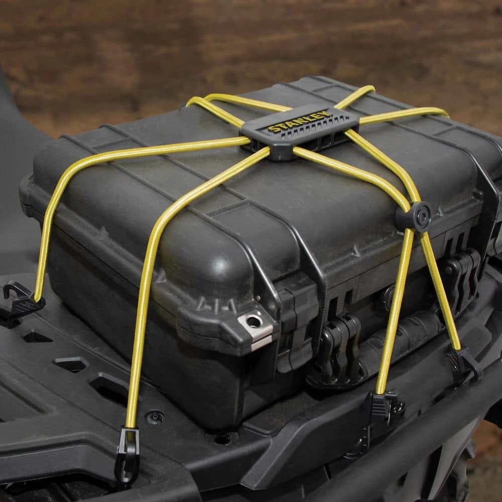 - A black coated STANLEY rectangular hub that anchors your cargo, working in conjunction with 8 premium bungee cord “arms”