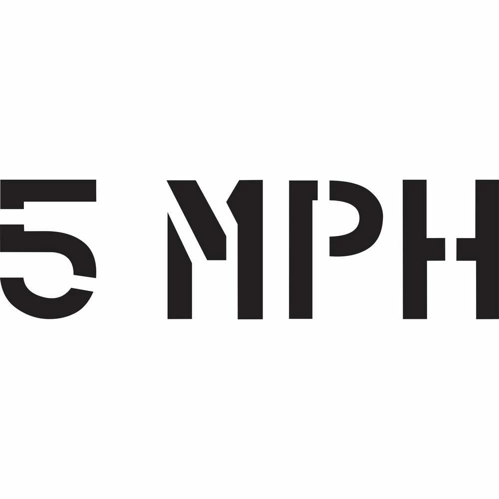 5 MPH pavement marking stencil. Characters are 24 in. high and total length of phrase when painted out measures 75.4 in. wide. MPH stencil is designed for parking lots, access roads, industrial facilities, lumber yards and more. This stencil is commonly used to control traffic in parking lots, malls, industrial facilities, condo complexes or any location looking to increase safety with pavement marking stencils.
